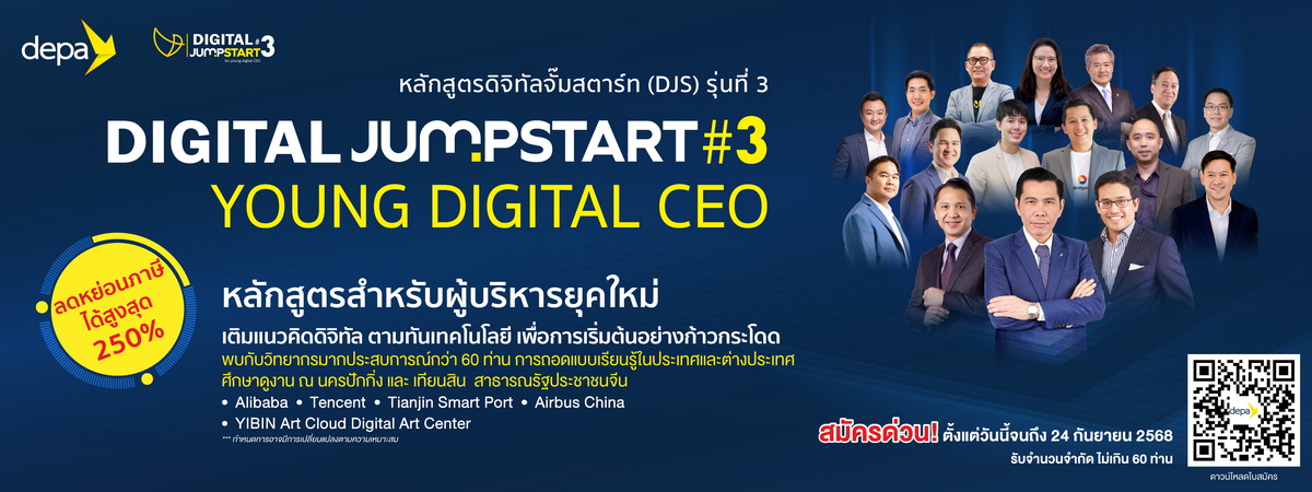 สำนักงานส่งเสริมเศรษฐกิจดิจิทัล (depa) เดินหน้าส่งเสริมบุคลากรภาครัฐและเอกชนเข้าสู่ยุคเศรษฐกิจดิจิทัล ผ่านหลักสูตร “ดิจิทัลจั๊มสตาร์ท รุ่นที่ 3” (Digital Jumpstart: DJS) ซึ่งออกแบบมาเพื่อพัฒนาศักยภาพผู้บริหารรุ่นใหม่ทั้งภาครัฐและอกชน หรือ Young Digital CEO ที่มีอายุไม่เกิน 45 ปี ให้มีความพร้อมในการขับเคลื่อนองค์กรในระดับประเทศและภูมิภาค