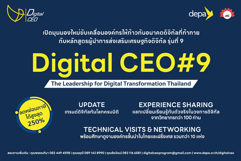 สำนักงานส่งเสริมเศรษฐกิจดิจิทัล (depa) โดย คุณธีรนันท์ ศรีหงส์ ประธานคณะกรรมการกำกับ สำนักงานส่งเสริมเศรษฐกิจดิจิทัล พร้อมด้วย ดร.ณัฐพล นิมมานพัชรินทร์ ผู้อำนวยการใหญ่ สำนักงานส่งเสริมเศรษฐกิจดิจิทัล ร่วมบรรยายเปิดหลักสูตรอบรม “ดิจิทัลจั๊มสตาร์ท รุ่นที่ 3” (Digital Jumpstart 3) เพื่อพัฒนาผู้บริหารยุคใหม่ รองรับการพัฒนาเทคโนโลยีและผลิตกำลังคนดิจิทัล เพื่อเสริมทักษะองค์ความรู้ สร้างความเข้าใจ และเปิดมุมมองด้านเศรษฐกิจดิจิทัล เพื่อเตรียมความพร้อมให้กับผู้บริหารยุคใหม่ที่จะเป็นกำลังสำคัญในการพัฒนาหน่วยงานหรือองค์กรในอนาคต ณ โรงแรมควีนสแลนด์ กรุงเทพ